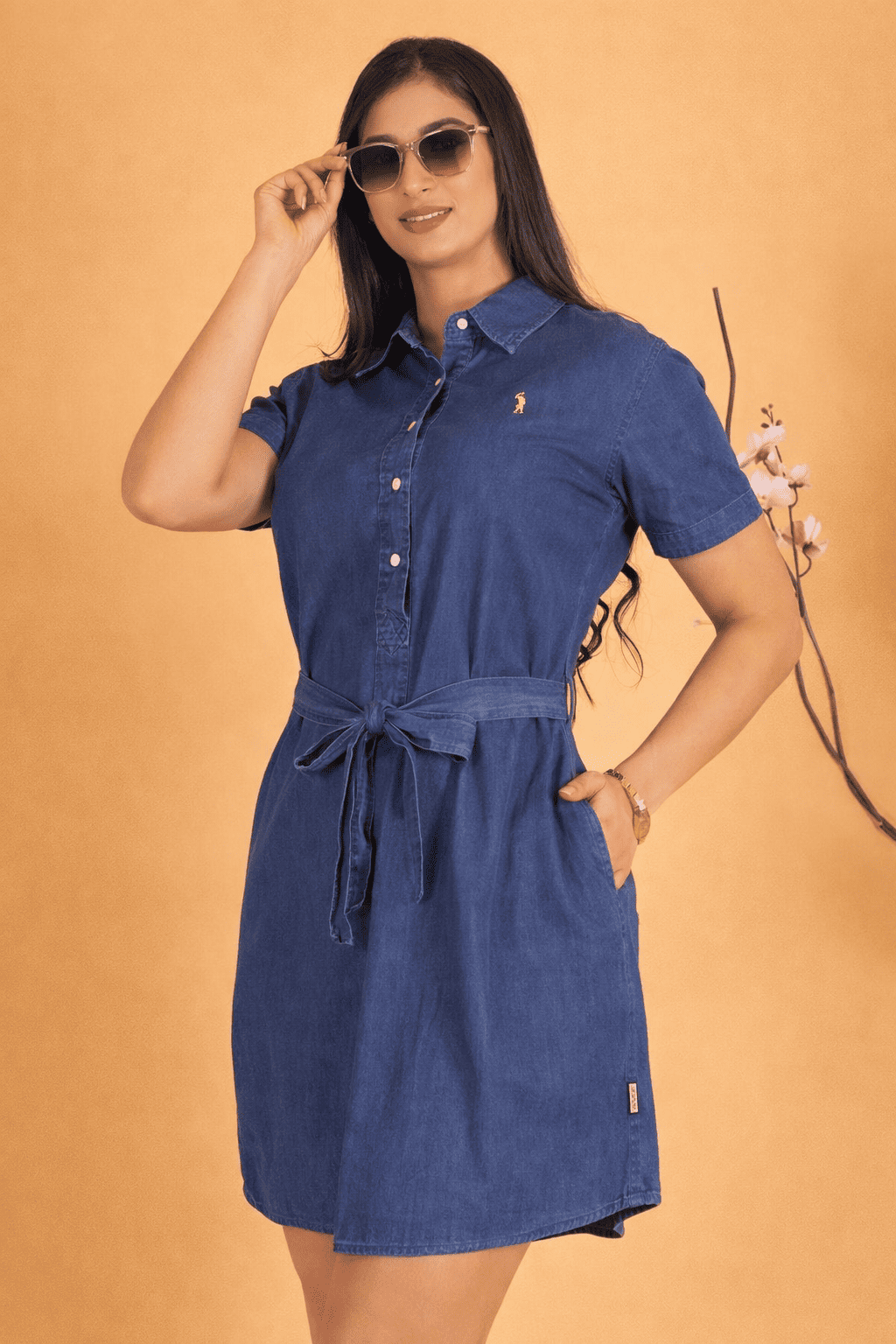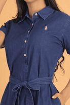 Vestido denim azul oscuro cerrado con cinturón | Cambridge Polo Club