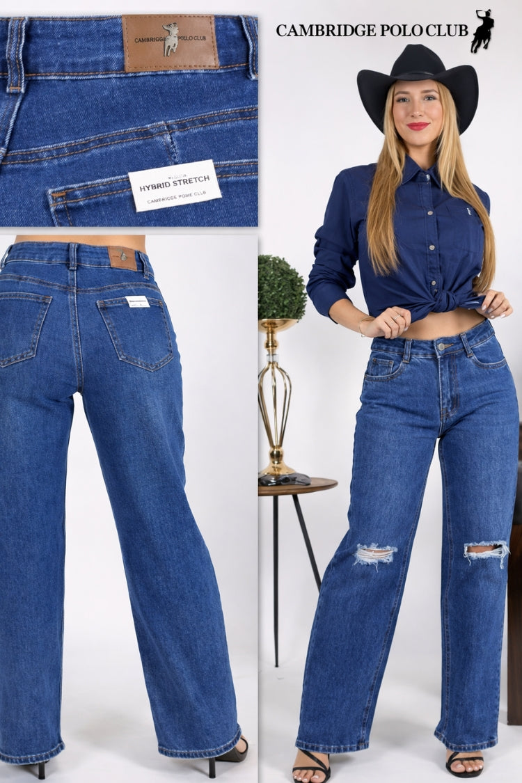• Material: Denim con tecnología Hybrid Stretch • Corte: Straight / Recto • Tiro: Alto • Color: Azul medio • Detalles: Rasgados en ambas rodillas • Marca: Cambridge Polo ClubEnvíos y devoluciones 🚚