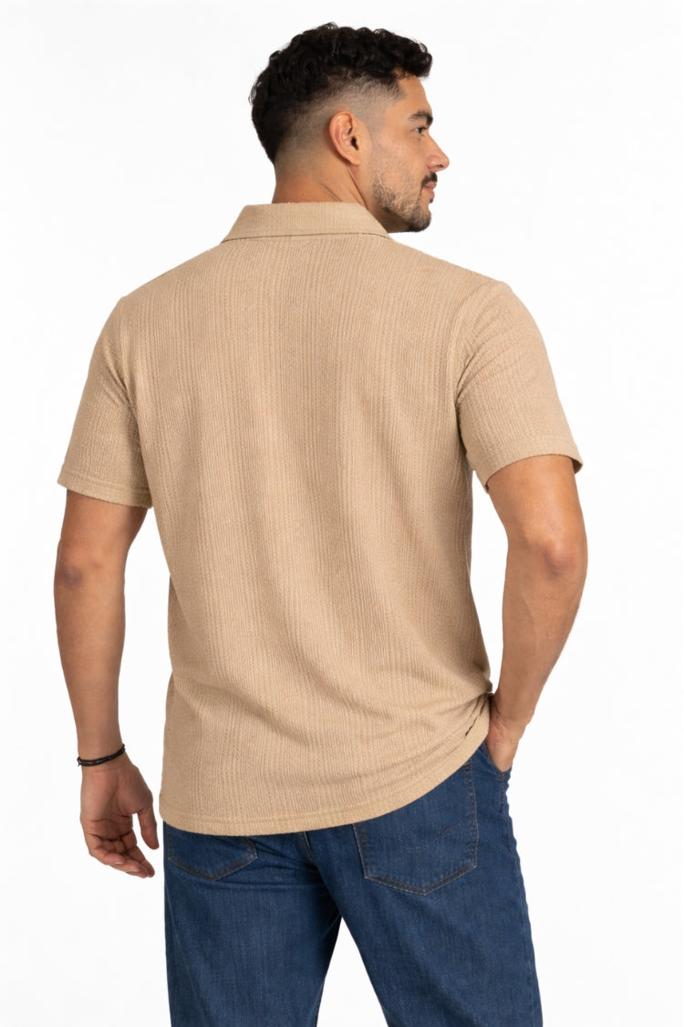 Esta camisa tipo polo para hombre combina elegancia discreta con comodidad real para tu día a día. Su tejido jacquard con carriles verticales texturizados le da una apariencia estructurada y estilizada, ideal si te gusta verte bien vestido sin esfuerzo.