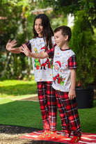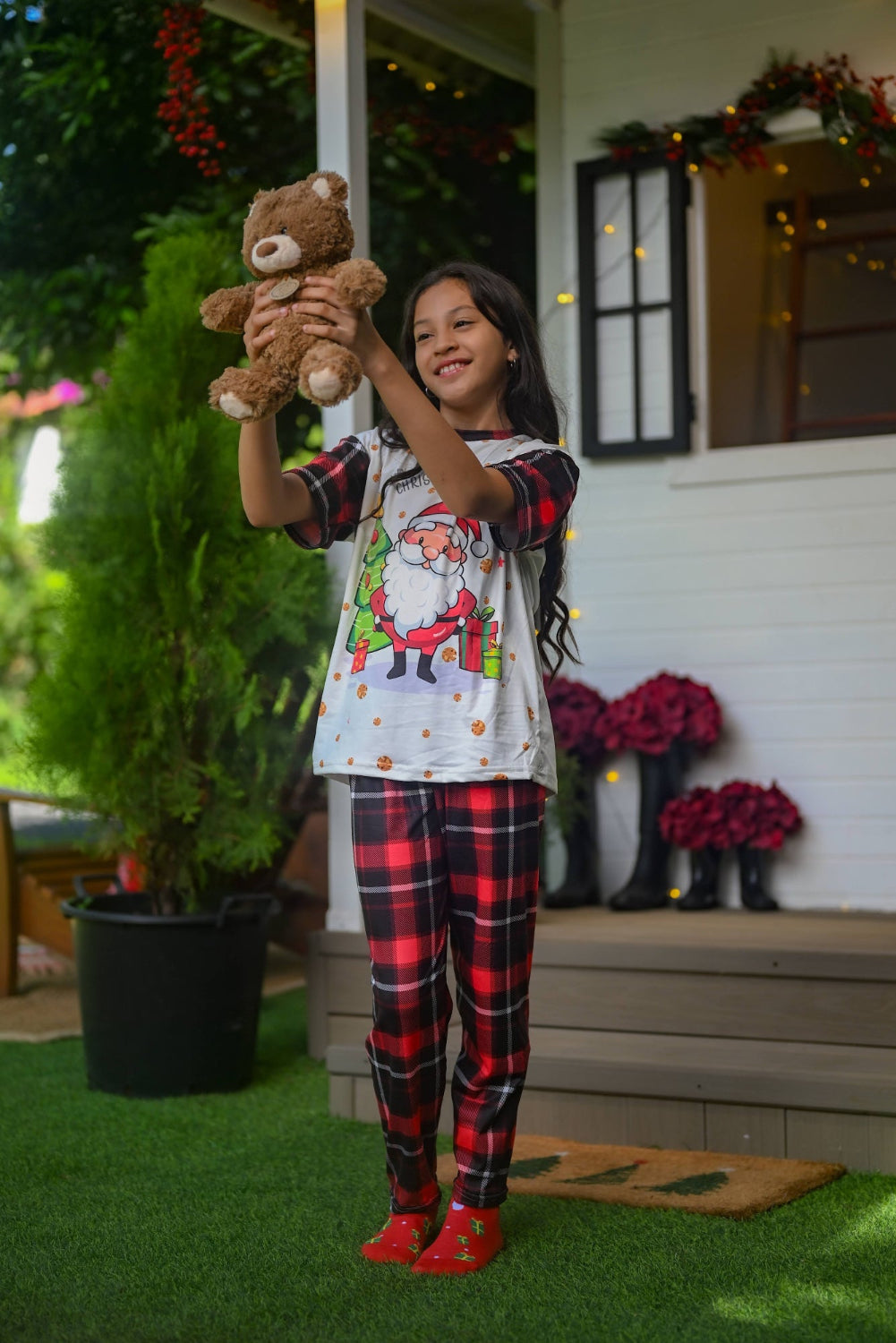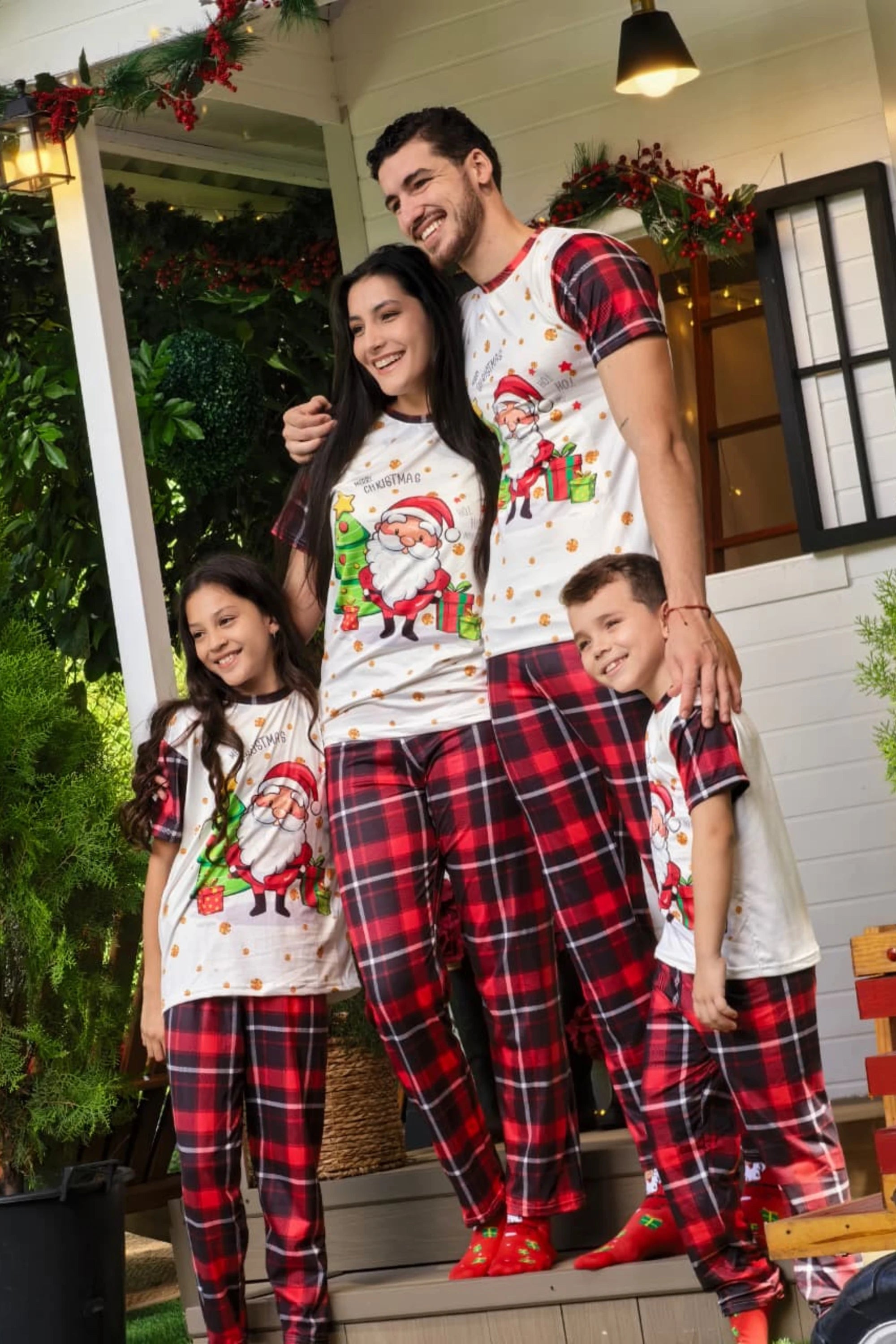Llena tu hogar de alegría y espíritu navideño con esta pijama familiar de cuadros rojos, perfecta para noches festivas, fotos familiares y momentos inolvidables. El conjunto combina una camiseta estampada con Santa Claus y pantalones a cuadros rojos y negros.